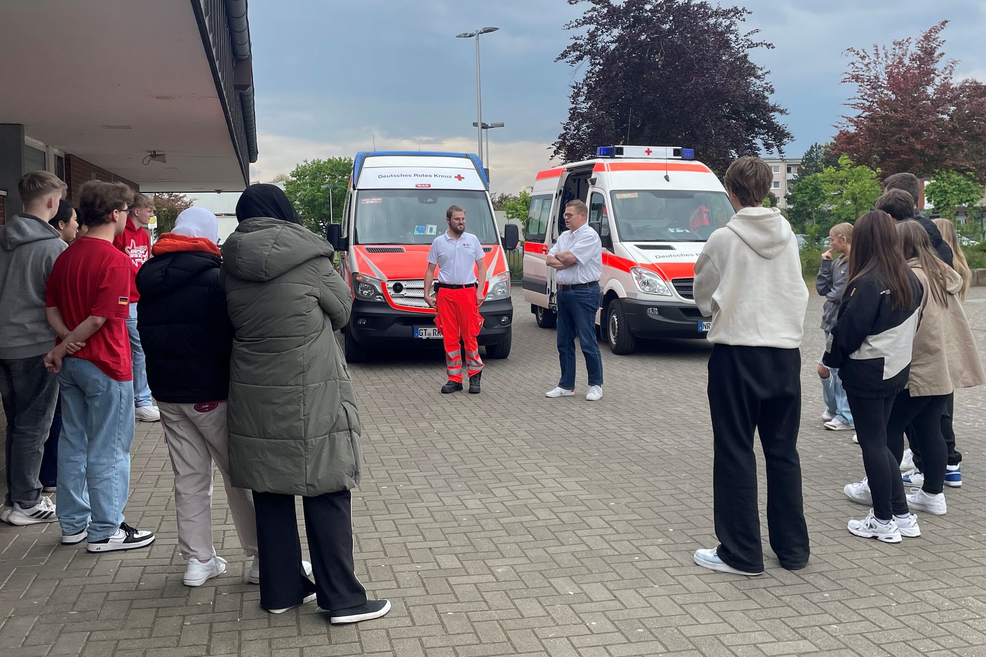 Christian Schumacher und sein Kollege Fabian Schnelder demonstrieren den Schulsanitätern den Unterschied zwischen einem Rettungswagen und einem Rettungstransport.