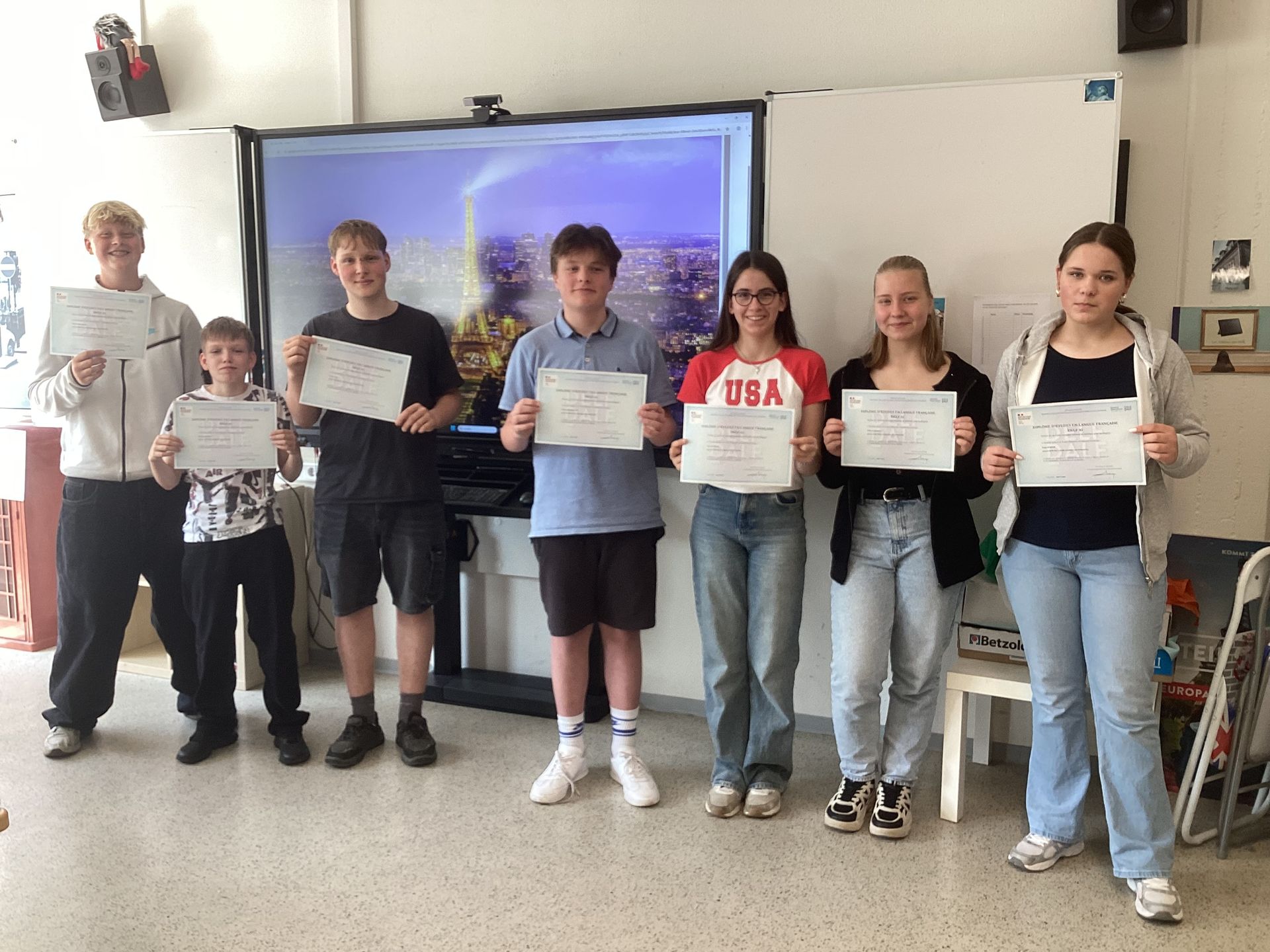 Das Ministère de l’Education Nationale (das französische Schulministerium) hat 8 SchülerInnen der Realschule Steinhagen ihre guten Französischkenntnisse attestiert. Die 8 RealschülerInnen haben an 2 Tagen gezeigt, was sie im Umgang mit der französischen Sprache können: einer mündlichen Prüfung mit frankophonen MuttersprachlerInnen folgte die schriftliche Prüfung, in der die SchülerInnen Fragen zu einem gehörten und einem geschriebenen Text beantworten mussten und anschließend selber Texte schreiben mussten – alles in französischer Sprache, bien sûr!