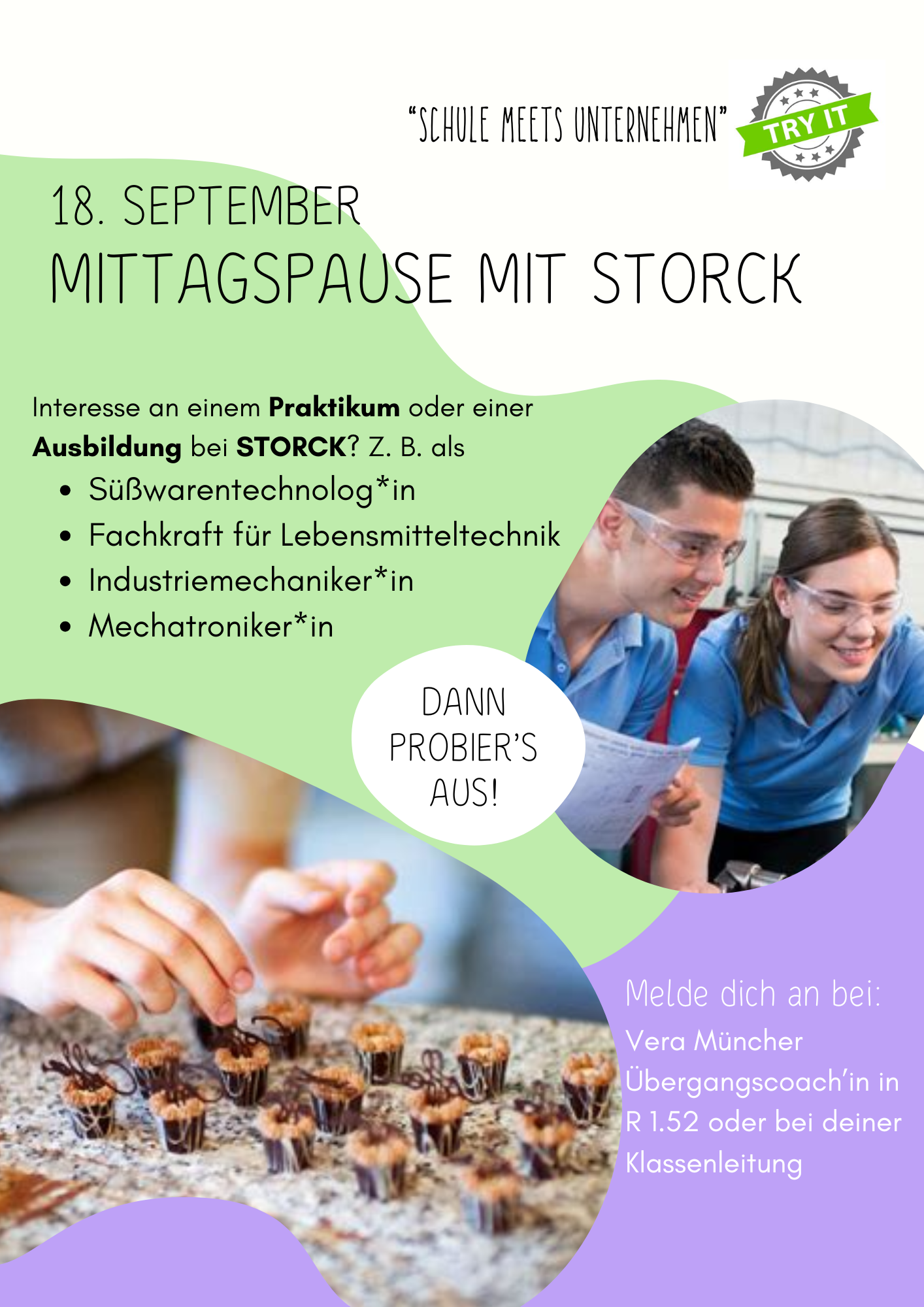 Liebe Schüler_innen, liebe Eltern, die Berufsorientierungs-Mittagspause „ Schule meets Unternehmen“ geht in eine neue Runde: Am 18. September 2025 kommt unserer Kooperationsunternehmen STORCK und bietet euch die Möglichkeit, vier spannende Ausbildungsberufe kennenzulernen: Süßwarentechnologe*in, Fachkraft für Lebensmitteltechnik, Industriemechatroniker*in, Mechatroniker*in. Wenn ihr gerne einen der Berufe praktisch ausprobieren wollt und in Jahrgang 8, 9 oder 10 seid, meldet euch möglichst schnell an - die Plätze sind auf 30 Schüler*innen begrenzt! Die Anmeldungen laufen über eure Klassenleitungen oder meldet euch direkt bei mir (Übergangscoachin, Vera Müncher, R.1.52, Mail: uebergangscoaching@rssteinhagen.de). Vielleicht habt ihr am Ende der Mittagspause euch dann schon einen Platz für eine Berufsfelderkundung, ein Praktikum oder eine Ausbildung in Aussicht?! Und für euer leibliches Wohl wird auch gesorgt: Es gibt Snacks, Obst /Gemüse, Getränke und bestimmt auch Süßes von STORCK:-)